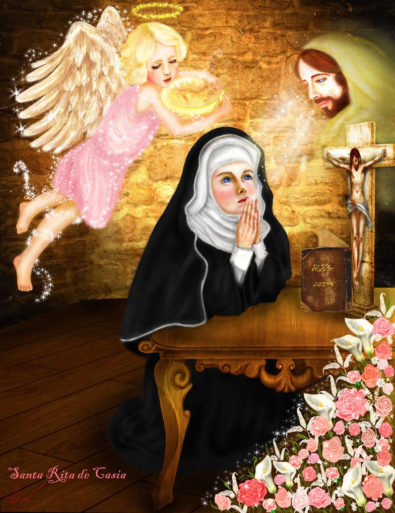 Oh Dios, Padre Santo, a quien llegan a adorar y a alabar coros de ángeles, y a quienes me uno para alabarte, te ofrezco en este día todos los méritos de Santa Rita de Casia, la protectora y patrona de muchos. En especial el gran amor con que te amó. Amén.