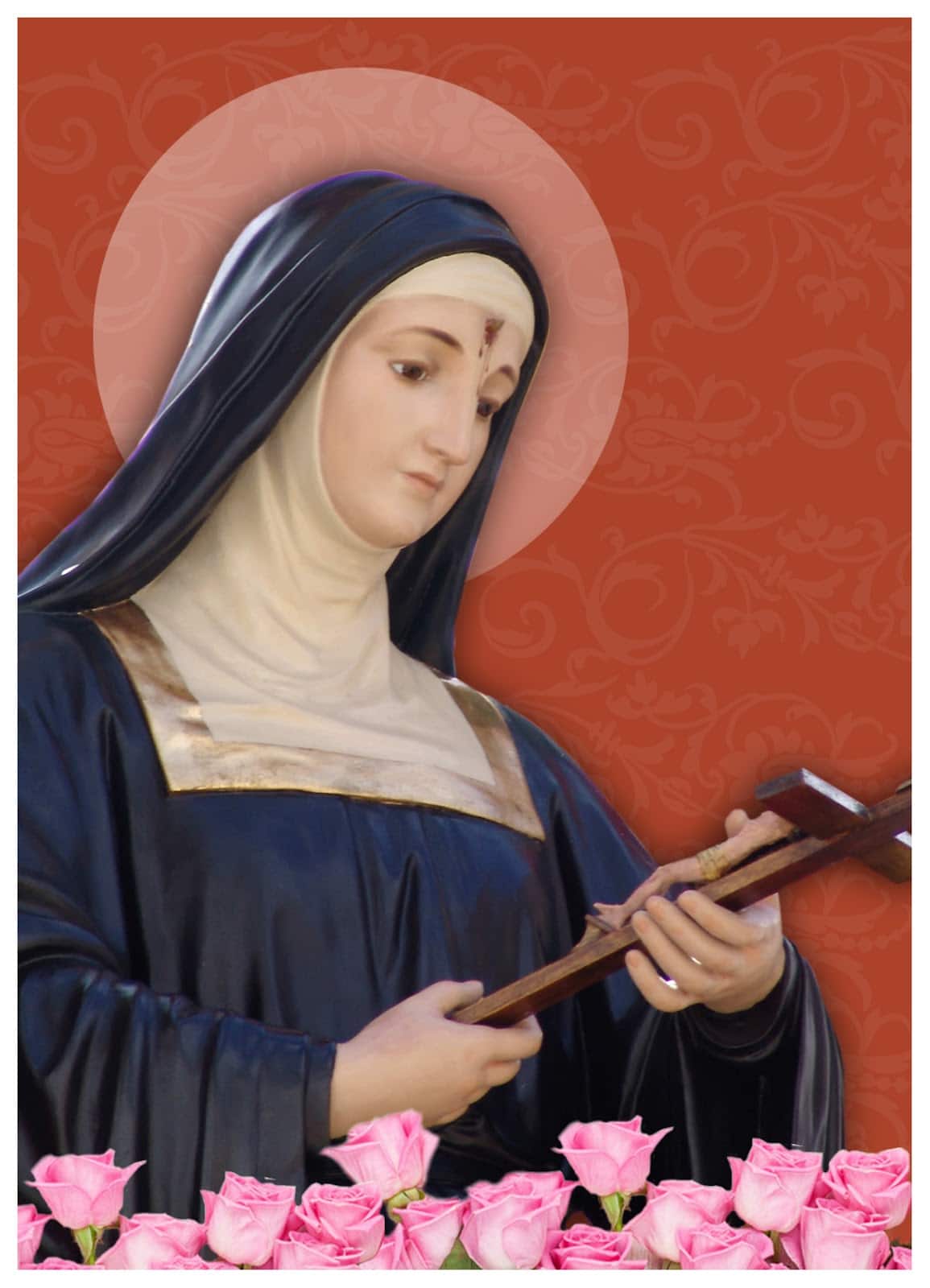 En este día te saludo, Santa Rita, la gran esposa que entre las espinas de dolor fue que naciste, siendo el vaso y aun la Rosa de Cristo, el divino amor de él. Señor mío, Dios nuestro, que llegaste a conceder a Santa Rita la gracia de poder llevar en su frente la señal de tu Pasión y en su corazón la gran caridad ardentísima del tuyo.